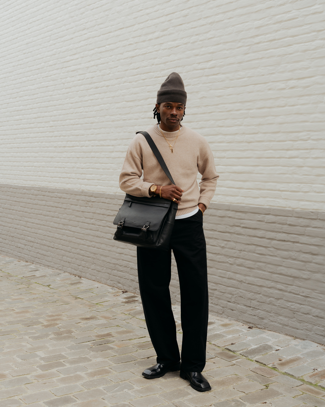 When worn on the shoulder, the bag sits close to the body and keeps a neat profile under the flap. The solid black finish and minimal detailing suit both workwear and casual outfits, while the front buckles provide a clear point of closure and structure. Inside, the lined interior and pockets make it easy to separate chargers, documents and personal items.
