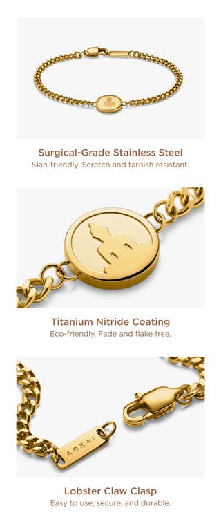 Made from 316L stainless steel with a warm gold finish, this bracelet features a small round medallion engraved with a Buddha motif. The curb-style chain and low-profile disc create a clean, minimal silhouette. It is nickel-free for comfortable wear.